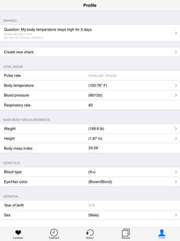 We let you store and manage all your past and present symptoms and conditions, log treatments, set medication schedules and reminders, check drug and allergy interactions, upload lab results and images, and explore your health data using a set of visual charts and reports. The feature integrates with Apples HealthKit.