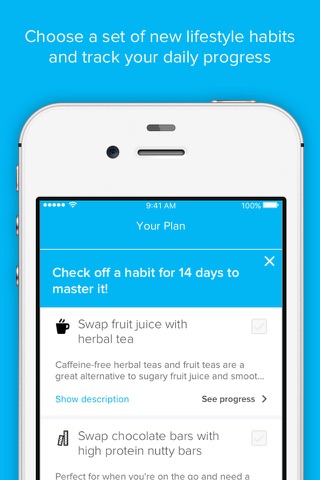 Complete our quick and easy assessment and we’ll tailor an Action Plan to suit your personal goals. We’ll provide you with fun and practical new habits to adopt, which you’ll be encouraged to check off daily as you track your progress towards mastering each one of them.