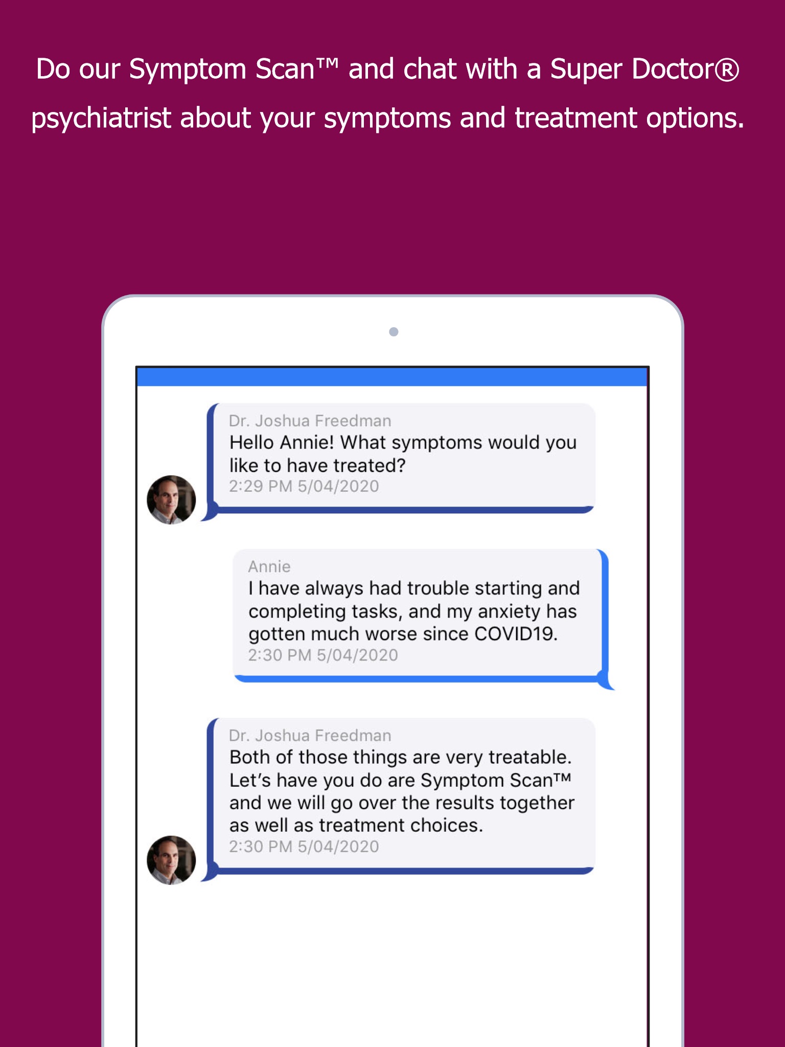 You will do our Symptom Scan™ and chat with a Super Doctor® psychiatrist about your symptoms and treatment options, all for free, in fact, without even entering a credit card.