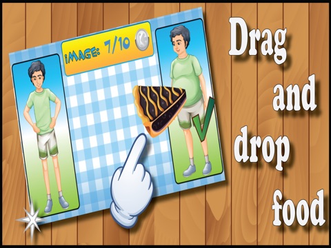 Child using a finger dragged pictures of food into two sides, depending on what character the image is more suitable. Healthy food fit on healthy picture of boy or girl and fat food or fry food picture fit on sad kids.