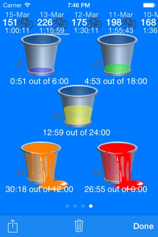 Paint Bucket Display: If you choose one of the workouts called “Easy 30” or “Moderate 45” or "Vigorous 60” the paint bucket functionality of time in zones is turned on. This screen display shows five different paint buckets which fill during your workout with the matching color of the zones. The goal is to fill each of the buckets without spilling over. If a bucket is not full then there wasn’t enough time spent in that specific zone and likewise, if the bucket is spilling over, there is too much time spent in that zone. As your workout progresses, there is a count-down timer below the image of the buck to show the amount of time left until the buck is full.