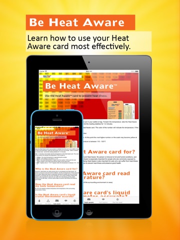 Whether working in a factory or playing on a football field, excessively high temperatures can take a toll and have serious health consequences. The Heat Aware™ card and app have been developed to be used as tools to help raise awareness and decrease risk for those working or playing in extreme heat conditions. The Heat Aware™ app is your pocket reference for heat illness prevention with features including: