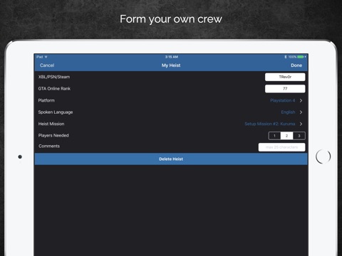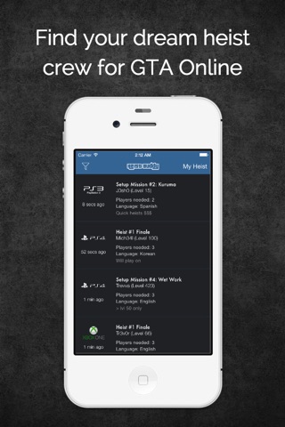 * Users post heists for others to join, and remove it once they have a full crew