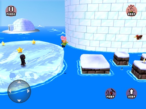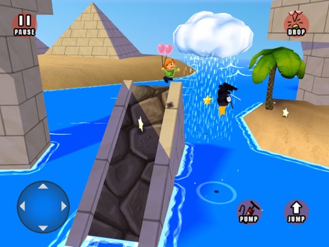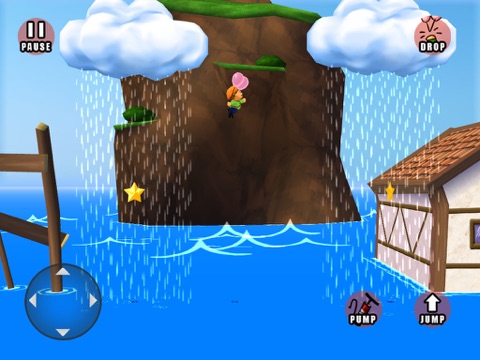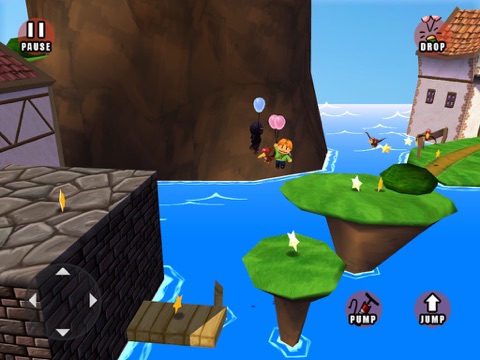 The game uses an onscreen gamepad. Touch the directional pad to move in the character in any direction. Press the Jump button repeatedly to fly with the balloons. If the balloons pop, press the Pump button to get new ones, or jump around without them. You can also let go of the balloons at any time by pressing the Drop button.