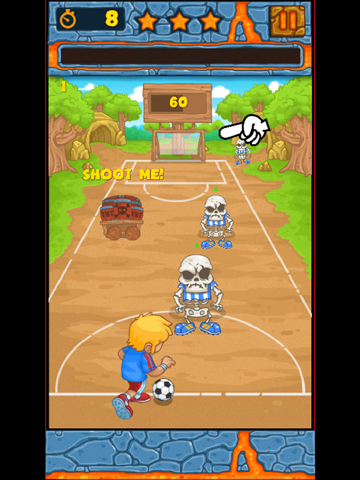 Move your footballer to the left and right, press and hold to increase shot strength (go to the maximum to knock-down enemies!). Score as many goals as you can, since they bring most points and you need to reach certain amount of points to pass the level.