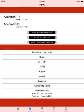 In the Inquiry section you can contact and book a Apartment directly with the eMail or Phone function of the App.
