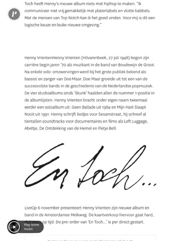 Henny Vrienten heeft een album gemaakt. Geen compilatie losse liedjes, maar één geheel. Samen met Pause hebben we deze app gemaakt om het gevoel van een album te creëren, in een digitale omgeving. Een beetje klassiek en tegelijkertijd toekomstmuziek dankzij alle nieuwe mogelijkheden.