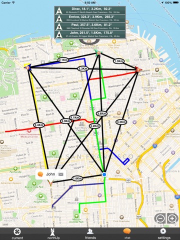 You can share the current locations and tracks of your friends up to 4 by Apple remote Notification service. it is convenient for meeting your friends, because you can see the current locations of your friends in real time. You can select the sending interval from 15sec, 30sec or 60sec. Your friends iPhone can be registerd via Bluetooth or e-mail. you can define the group of the friend.