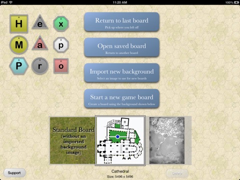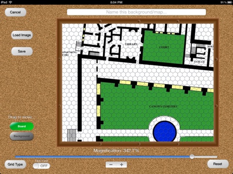 Hex Map lets you quickly and easily set up a game on your Apple device. Choose a background (from some textures provided or any map or image you create or find on the Web), decide whether you want a hex or square playing grid (or neither), and set up your pieces.