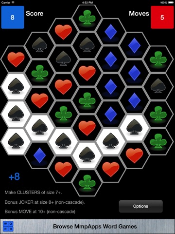 HEXAGONE CLUSTER: Slide symbols to adjacent hexes to make clusters of like-symbols. A cluster is a set of symbols where each symbol in the set is adjacent to at least one other symbol in the set.