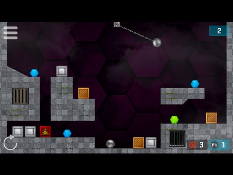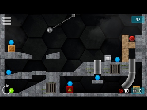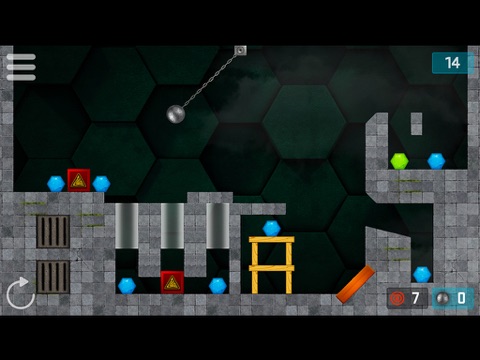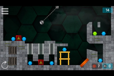 Swing the pendulum and release the wrecking ball with perfect timing to destroy the hexagonal jewels in as few moves as possible. Destroy the blue hexagons to pass the level, and the more difficult green hexagons to unlock bonus levels.