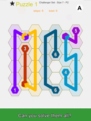To solve a puzzle, create paths by connecting matching pairs of dots. The puzzle is solved when all dots are connected & the whole board is filled!