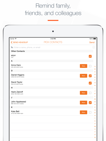 Simply enter a phone number, an email, or another username to schedule a HeadsUp for someone else. You can remind those with a smartphone or even a flip phone!