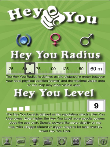new people nearby, which have the same intention like you, just Hey You. Use the selector to show males or females or even