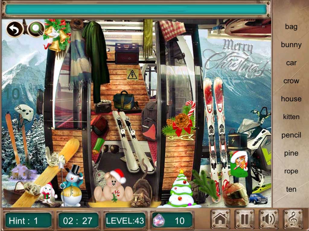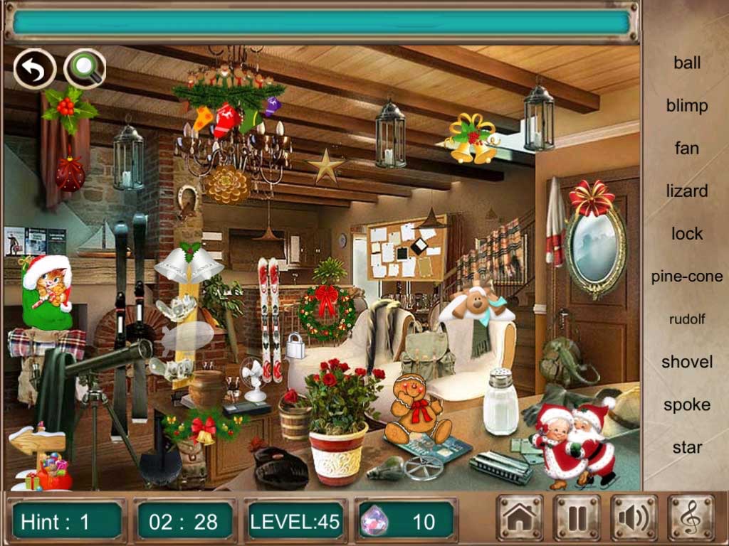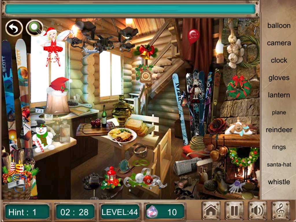 - Find 10 objects through object names in beautiful hidden object scenes.