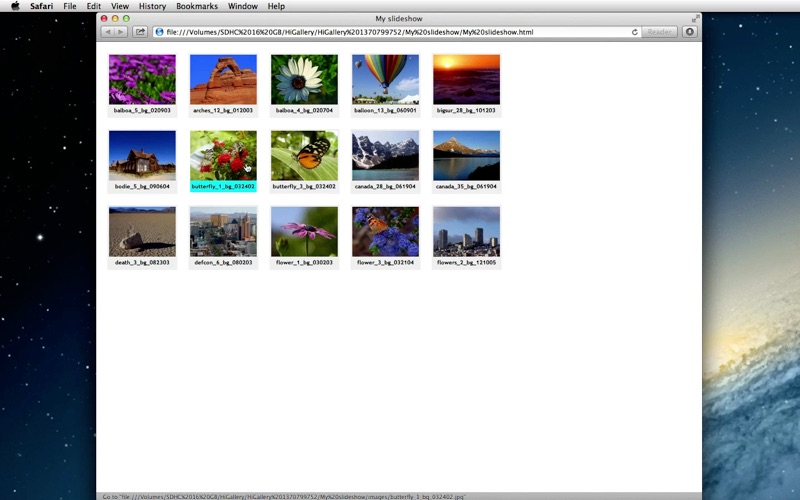 So what you create with HiGallery is a browser-based photo collection. You can enjoy viewing your photos on your desktop computer (Open the html file in the export package with a web browser of your choice.) or post it on a remote server so that other people can view it.