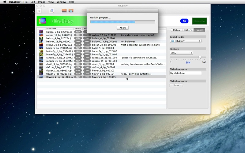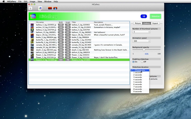 HiGallery is an easy solution to managing and organizing pictures. HiGallery allows the user to create a browser-based photo collection that can be viewed across different operating systems. Use your favorite web browser to browse photos. Add titles and descriptions to pictures. Save your project at any stage so that you can edit your photo collection whenever necessary. All you have to do is double-click a project file. You can make your photo collection a slideshow powered by jQuery, which can automatically switch pictures.