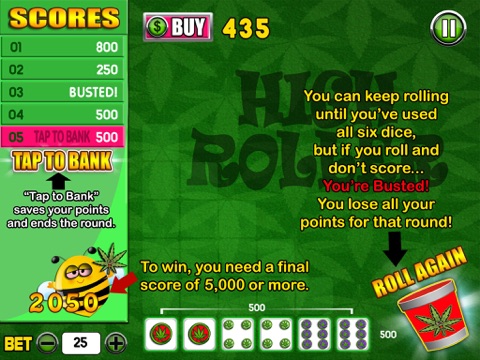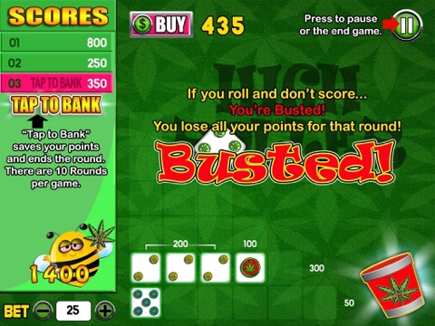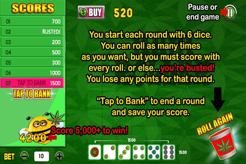 To "bank" your points and move on to the next round, tap on the prompt in the left-hand column that says "Tap to Bank." Otherwise, tap the dice cup to roll the remaining dice. But beware: If you roll and dont score any points - Youre Busted! You lose any points you had won during that round.