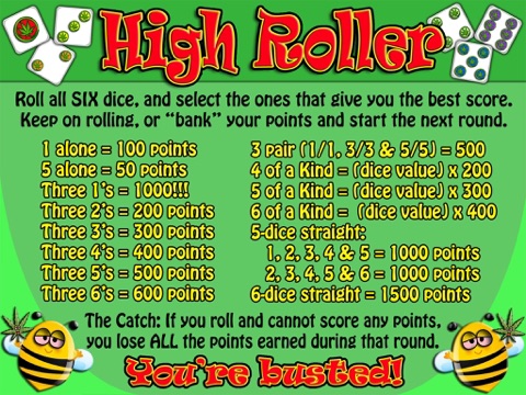The instructions and scoring table are literally "at your fingertips"! Just tap the "Instructions" button on the main menu at any time. But we think youll get the hang of High Roller pretty quickly: To score, you need either a 1 or a 5; 3 pairs; three or more of a kind; or a straight (5 dice or six dice). Just dont get busted!