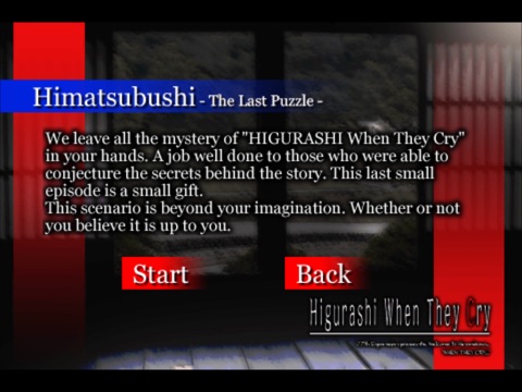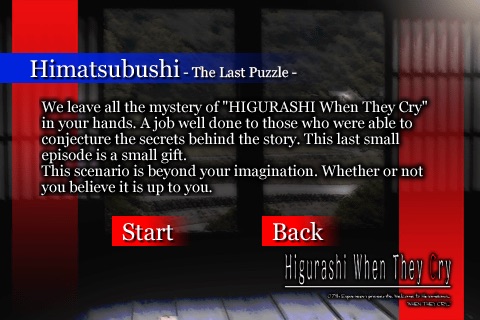 Please enjoy the experience of the village of Hinamizawa in 1983 through this new iPhone application!