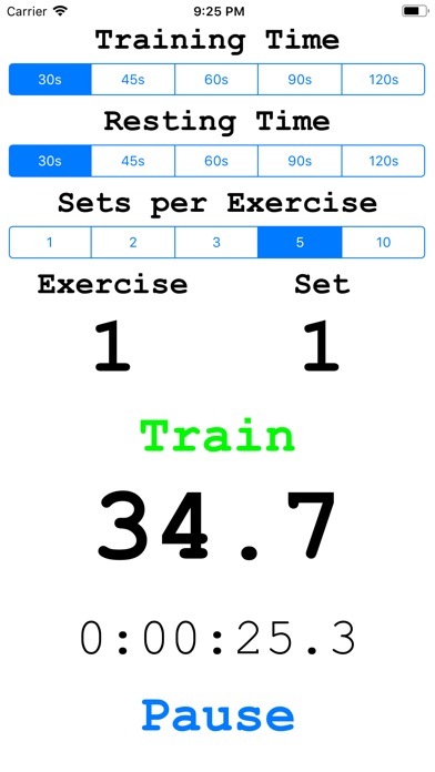 This app provides a timer for High Intensity Interval Training (including Tabata). It allows you to select the training time and resting time for each set, and allows you to select the sets per exercise. The timer provides both a visual countdown display of the time remaining, for each set, and an audible beeping for the last five seconds of each set. You therefore know when a set ends without even looking at the display, allowing you to focus on your training.