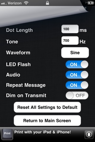 Type your message and press play to transmit your Morse Code using the LED on your device and the Audible tones (if enabled).