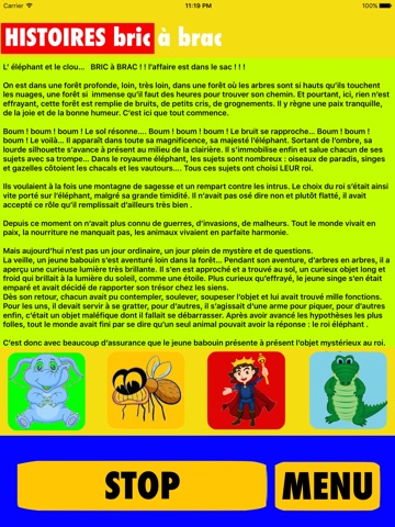 Le texte de chaque histoire est accessible avec le bouton texte. Ceci permet aux enfants comme aux adultes de lire chaque histoire.