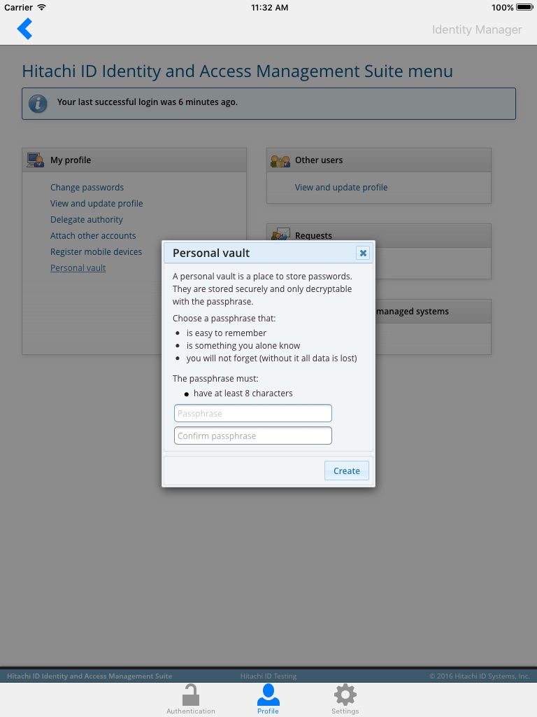 Once signed in, you can access all the Bravura Security Fabric Services you need to keep working including requesting or delegating access, unlocking accounts, and checking out privileged passwords. The app also provides a second layer of security with a multifactor authentication process to prove its really you. From the portal, access and securely store passwords in your personal vault, change passwords, seamlessly approve requests, and more.