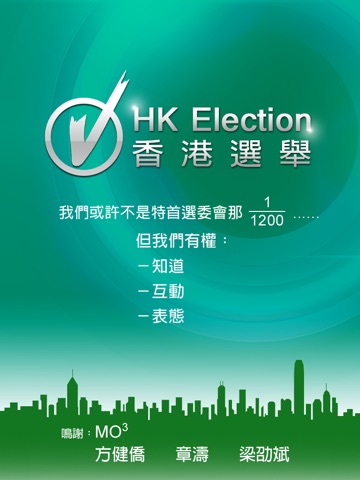 "第四屆行政長官選舉相比歷屆更為激烈,也許我們未必是那1200名選舉委員會的成員,也許我們還有更多聲音想要發出,三位資訊科技企業創辦人:章濤、方健僑、梁卲斌希望藉此程式給予公眾更即時、更便攜的方式了解整個選舉流程"