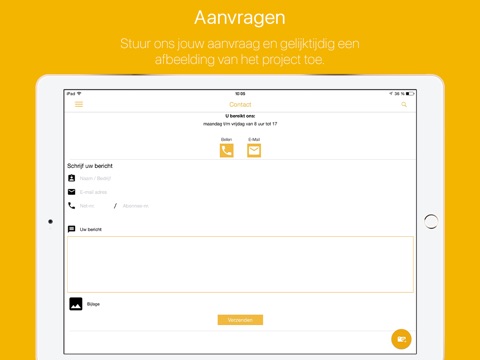 Met onze App kunt u ons ook onderweg via uw smartphone of tablet aanvragen sturen of op de bouwplaats met de App een foto maken van het project en ons deze direct toesturen. Als u thuis of weer op kantoor komt heeft u het antwoord per e-mail al ontvangen.