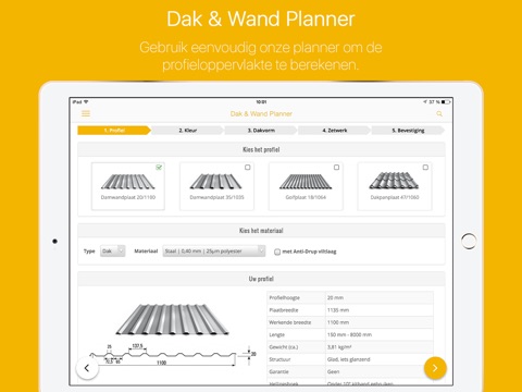 Met onze “Dak & Wand Planner” kunt u nu heel eenvoudig dak- en wandplaten als metalen platen of lichtplaten bestellen. Kies het model plaat, kies de kleur en kies de vorm van het dak of de wand en vul de afmetingen in. De Planner berekent precies wat u allemaal nodig heeft.