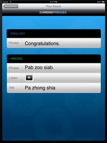 Learn to speak simple conversational Hmong phrases. These are very basic phrases to help you learn the Hmong language. Press the play button and you will hear the sound of how to pronounce the sentence in Hmong. You will also see the way to pronounce it. Surprise your friends the next time you see them with your new language skills! You can practice learning how to speak basic Hmong! This app works on the iPod, iPhone, and iPad! This app is also geared toward beginners who want to learn Hmong.