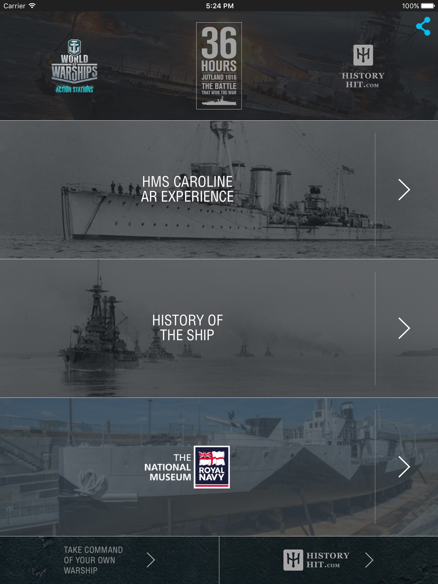 The HMS Caroline Augmented Reality App has been produced as part of the new blockbuster exhibition: 36 Hours, Jutland 1916, The Battle that Won the War exhibition at the National Museum of the Royal Navy, Portsmouth.