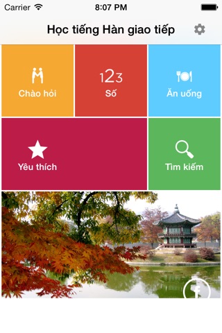 Ứng dụng Học tiếng Hàn giao tiếp (Talk Korean) với phần giải nghĩa tiếng Việt đầu tiên trên Kho ứng dụng. Nội dung chứa hơn 2000 câu hội thoại giao tiếp cơ bản dành cho các đối tượng chuẩn bị đi du lịch, học tập, lao động tại Hàn Quốc (South Korea) cần có. Các chủ đề về hội thoại phong phú, tất cả có 18 chủ đề: Chào hỏi, thời gian, chữ số, phương hướng, địa điểm, mua sắm, ăn uống, cấp cứu, hẹn hò, gia đình...