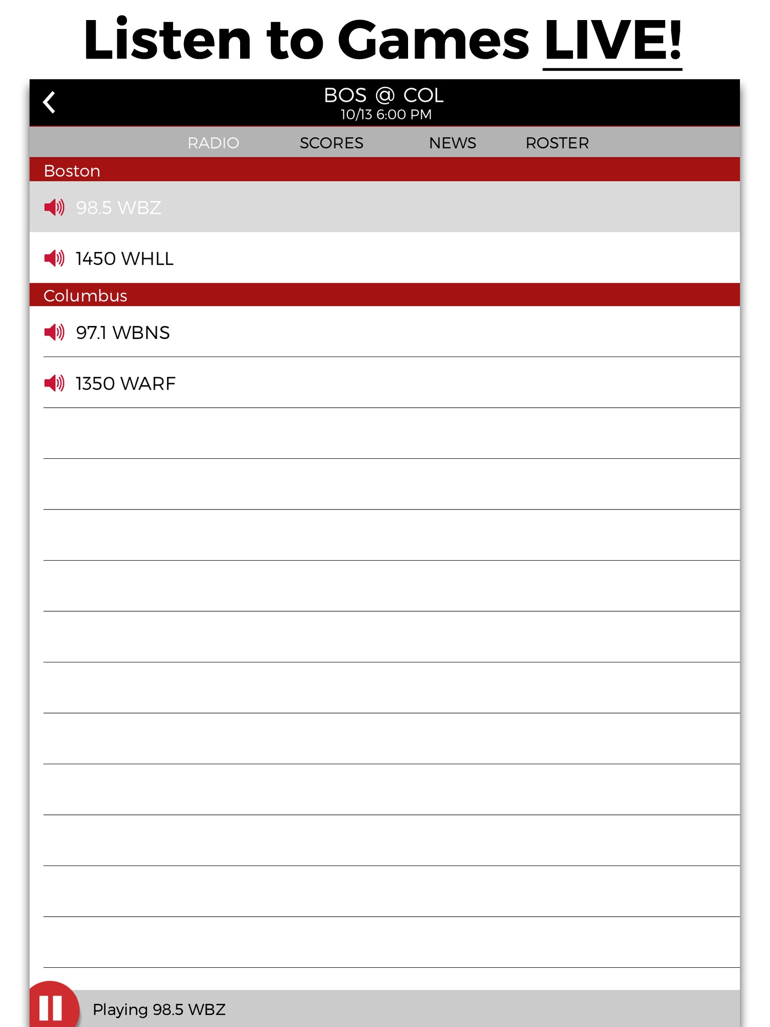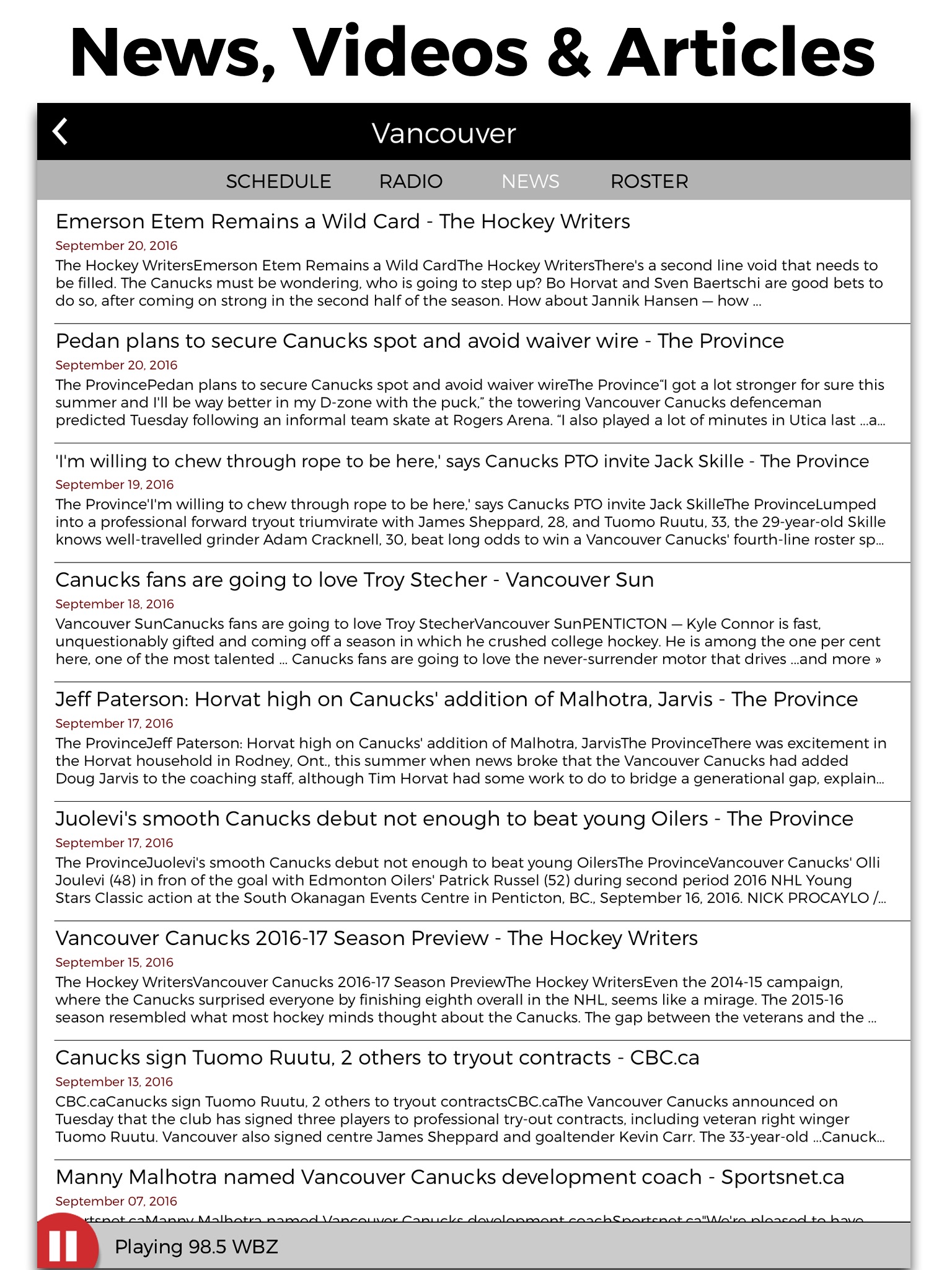 Has channels for 29/30 teams (doesnt have Minnesota wild but you can listen to the wilds games on the channel of whatever team theyre playing) perfect if you work late as I do and still want to catch your teams game. Well worth 99 cents for any hockey fan