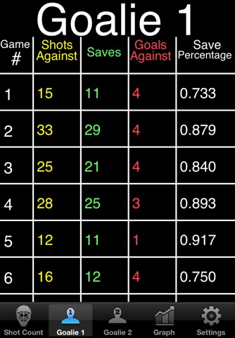 Hockey Shot Counter is used by coaches and fans all around the world. With room to store up to 100 games for 2 different goalies (200 total games), Hockey Shot Counter is the perfect fit for the regular or hardcore hockey fan or the coach that is looking to improve his team. The app calculates saves, goals against, shots, save percentages, and totals. With the new graphing feature you can even graph each goalies stats.