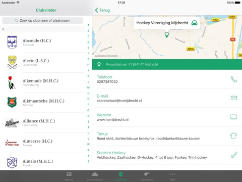 • Informatie over hockeyverenigingen, zoals tenue, route, adres en telefoonnummer
