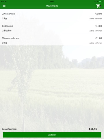 Im Menüpunkt Warenkorb finden Sie nun alle ausgewählten Produkte. Hier können Sie auch noch Änderungen vornehmen. Abschließend wählen Sie zur Kasse gehen.