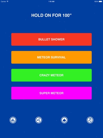 Hold On for 100" is a casual game inspired by the 1980s arcade game. Youll drive your cartoon spaceship either by tilting your phone or by swiping on the screen to avoid collision with and survive in the meteor shower. Its easy to play at first but hard to hold on. It tests your agility, attention span and endurance. Practically, you can hardly surpass 100 seconds, so dont be frustrated. Good Luck!
