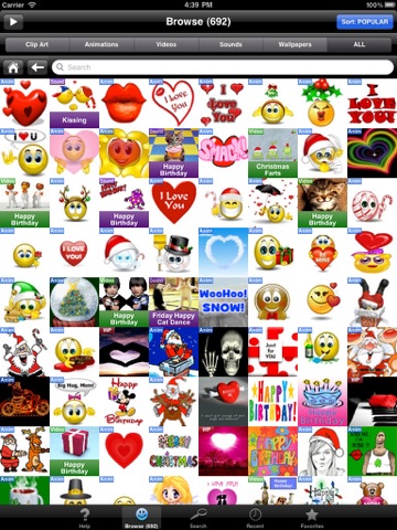 * ANIMATIONS ON FACEBOOK: You can send all the items found in CLIPish to Facebook, HOWEVER, Facebook converts all animations to still images, as Facebook does not allow animations to "play" on their site.
