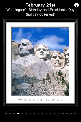 Each upcoming and past holiday is shown in a two-side page including the date, a live countdown, a gorgeous image allusive for that holiday, a bit of the history of the event celebrated on that holiday, as well as if the holiday is federal (observed) or not.