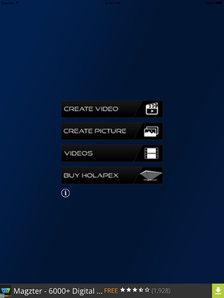 Description: Hologram pyramid videos already converter and ready to use! These videos and pictures work great with our Holapex pyramids and home made hologram pyramids. Click the Create video and download our app that lets you convert your regular videos and pictures into a 4 sided image and video to use with you Holapex pyramids!