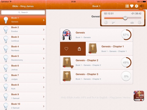 This application gives you the ability to read and listen to ALL the books of the Old Testament and the New Testament on your Iphone / Ipad / Ipod Touch.