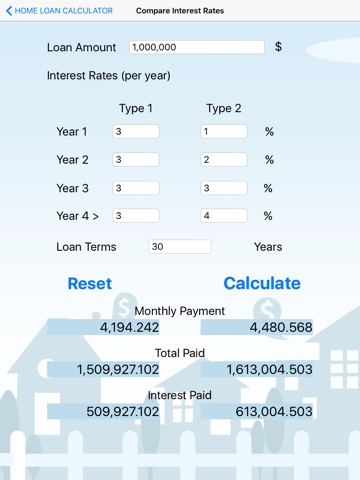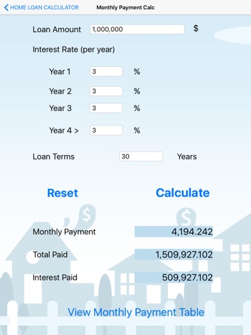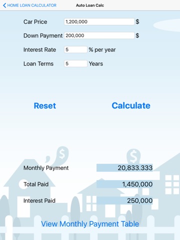 Use this app to determine the monthly payments of home loan, auto loan or other loans.