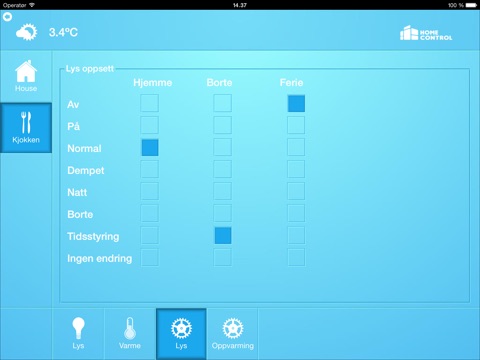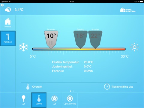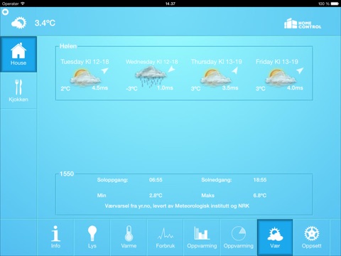 Vi tror en SmartHus app er bygget rundt hvordan du lever, ikke rundt enheter og av / på. Fortell appen når du står opp, jobber og legger deg – ja så ordner den temperatur regulering, sparing, lys av og på – helt selv. Systemet er også integrert med Meteorologisk Institutt så det justerer temperaturen basert på utetemperaturen.