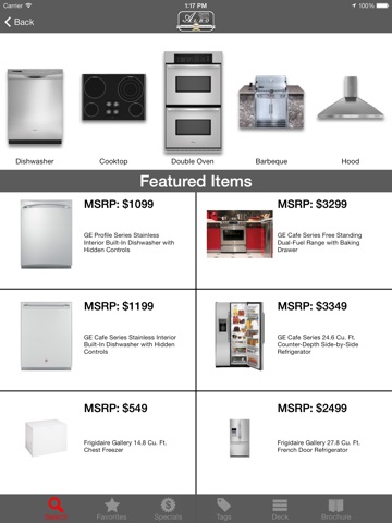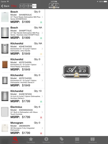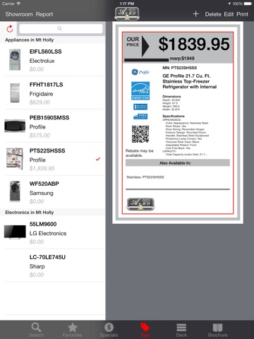 The dealer can choose to add as many product items as they choose (both appliances and electronics) to a list to go into a brochure. They can then share the brochure by either printing, or emailing it.