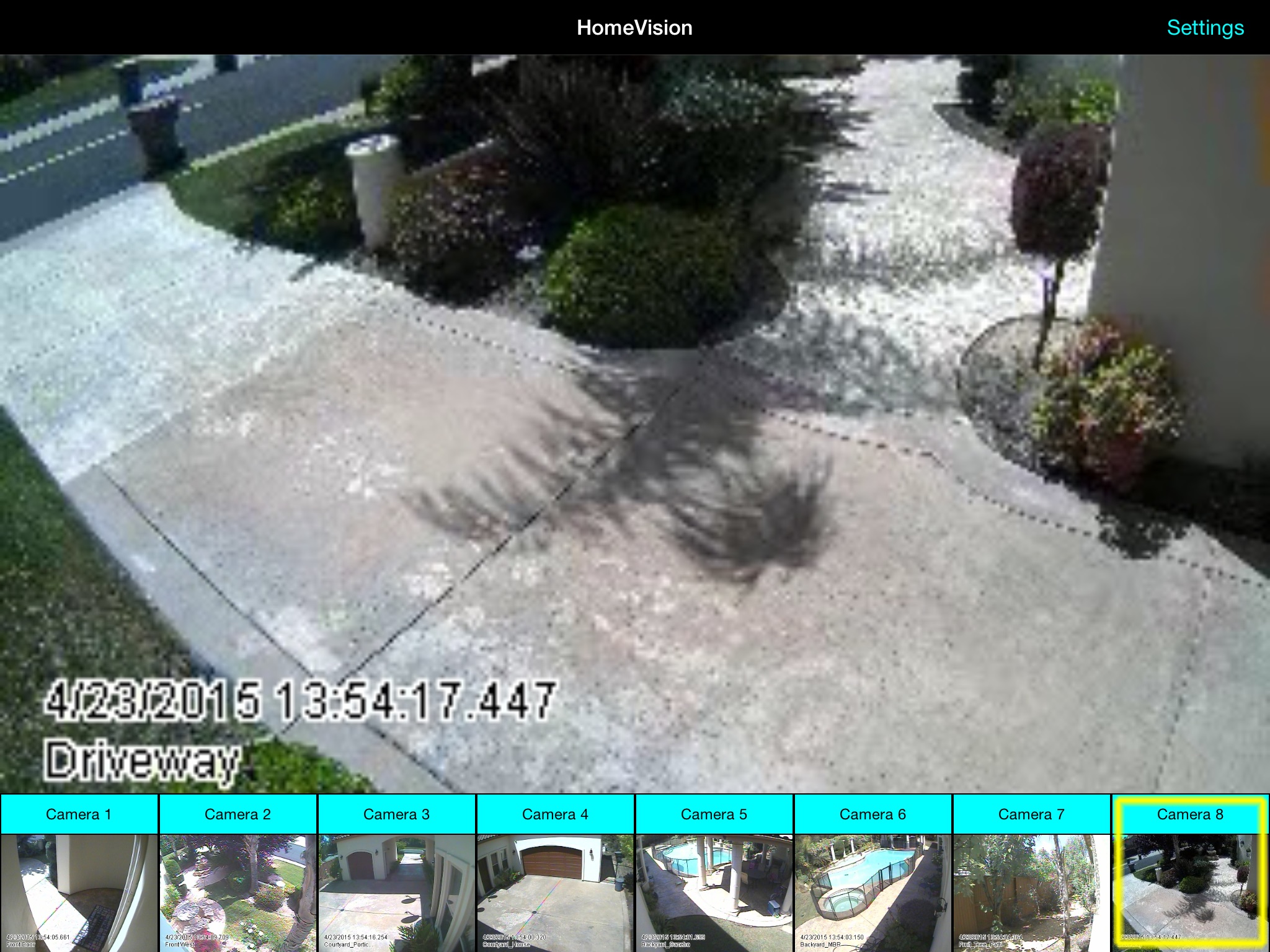 --> All you need to do is go to the Settings view ("i" on iPhone lower right corner of app; "Settings" on iPad upper right corner of app) and fill in your URI, username, and password. Then select the number of cameras you want to view. HomeVision does the rest!
