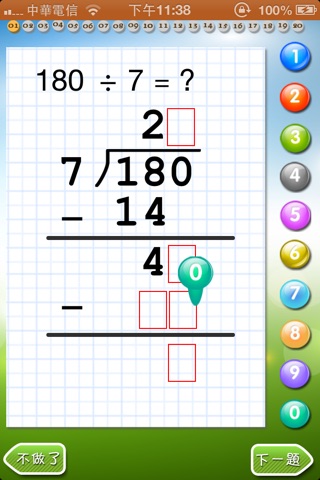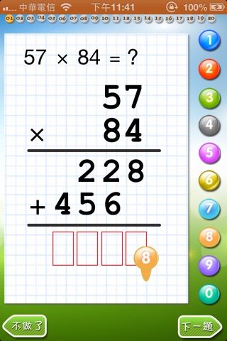 Children can drag the numbers in the expression on the screen upside to the right positions in the long calculation expression, as doing on the paper sheet. During the process, the melody music is playing and positive feedback would be given as children give right answers.