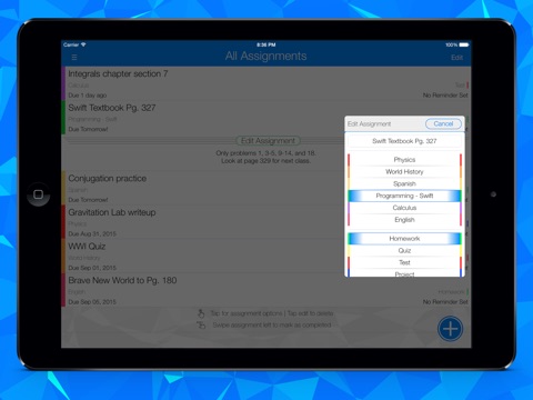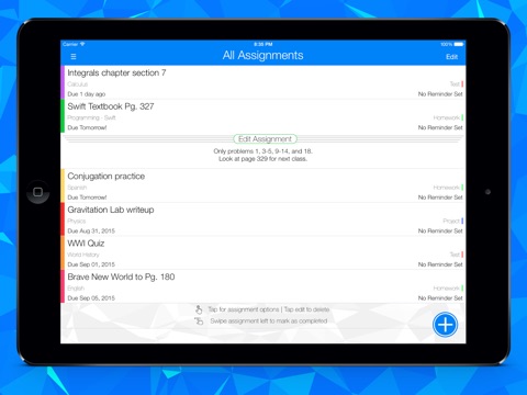 • Easily accessible assignment options: Tap an assignment to expand, view notes, and edit. Swipe left to mark an assignment as complete. Tap edit to delete assignments.