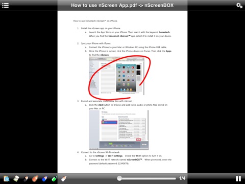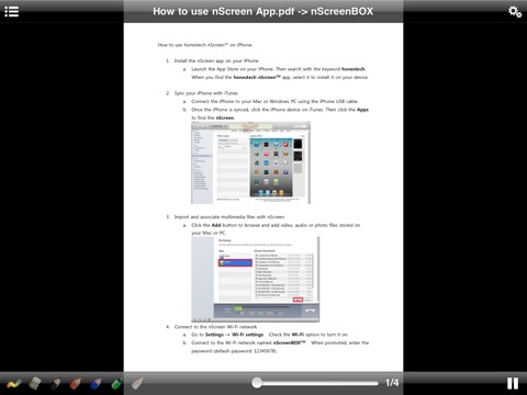 Stream PDF file via Wi-Fi to a display device such as a TV, projector or monitor. No need to gather around that tiny screen anymore, view presentation files on projector or TV. With the honestech nScreen™ Doc app, and the nScreenBOX™ (sold separately), you can stream documents from your iPhone or iPad to big screen TVs or projectors. honestech nScreen™ devices also accommodate multi-user access from different iPhones or iPads.